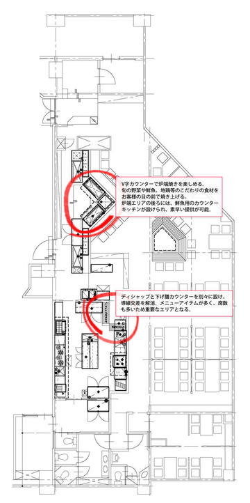 この事例では炉辺焼きをお客様が楽しめるようにV字型カウンターになっています。