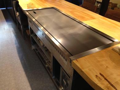 カウンターラインにはIHグリドルと板場が横に並び、調理工程が目の前で見ることができる厨房設計がお客さまに喜ばれています。